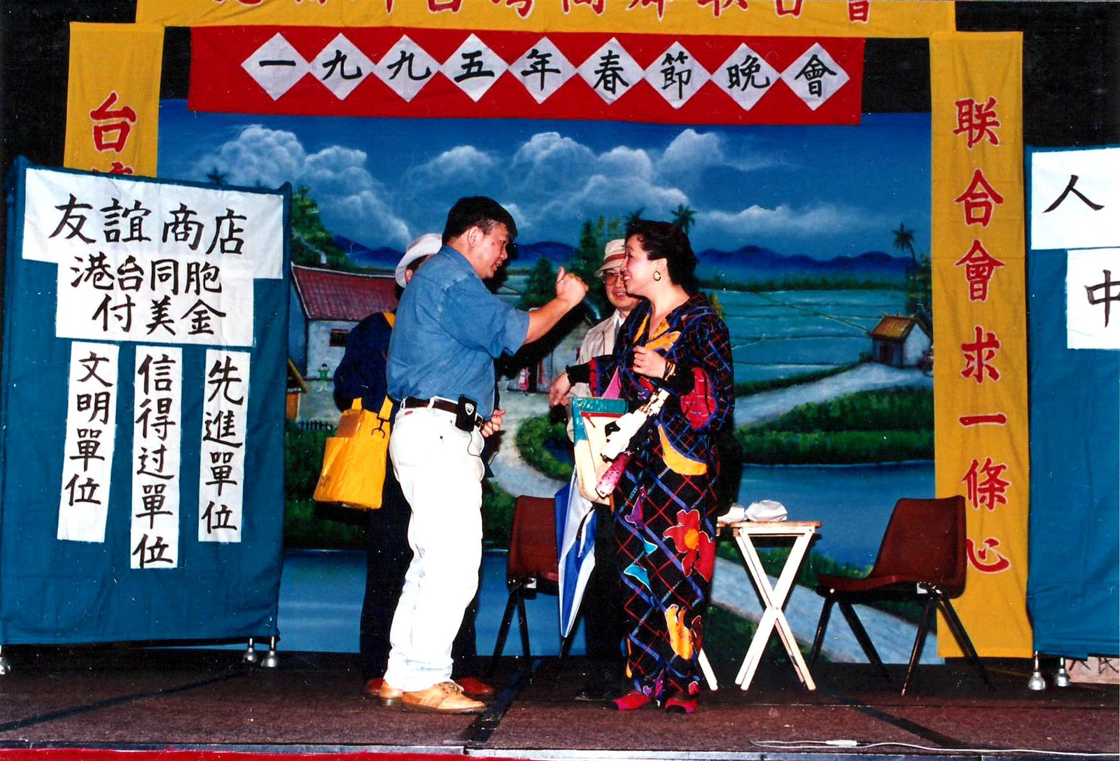 1995年1月28日演出《出唐山記》。余金榜攜帶鉅額美金,「衣錦」返鄉,回到魂牽夢繫的家鄉,受到親朋「熱烈」歡迎。但因中國貧困,民風貪婪,藉口要修房、買電視、…為由,將余金榜的錢財索盡,回台灣時只剩下內褲。他返台親吻台灣土地說:「還是台灣好,台灣才是我的家!」