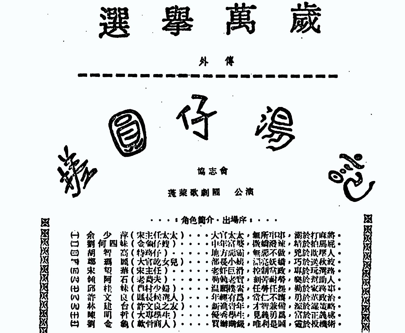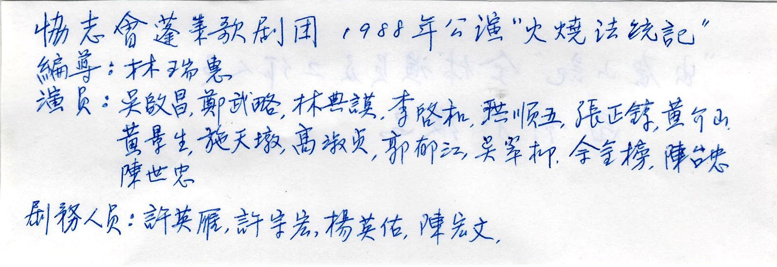 1986年8月16日演出。協調會希望蓬萊歌劇團不要演「簽證記」。李啓和會長召開緊急會議,結果與會者一致堅持要演且演兩集。